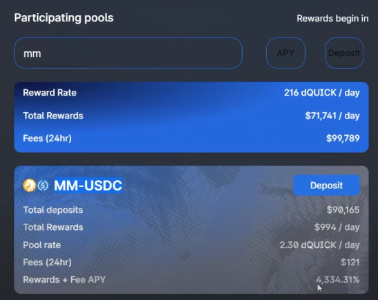 • 根据流动性凭证再抵押到Dragon's Syrup, APY高达 4334.31%,得到的dQuick直接换美元变现。