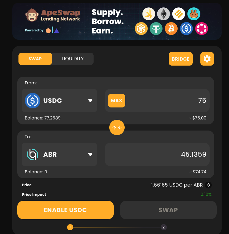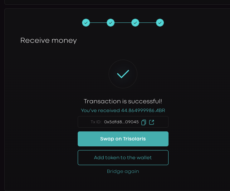 - 进行跨链转移,USDC换成ABR代币,从polygan转移到aurora链;