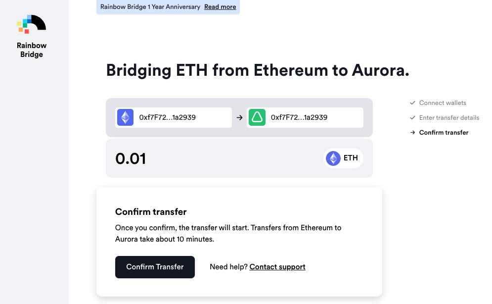 2.2 从Polygon转到Aurora过程中需要ETH gas fee,所以不得不又充值了ETH在eth主网上,通过bridge转gas fee到接受链。https://rainbowbridge.app/